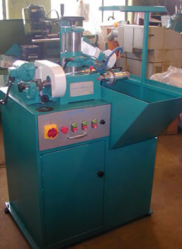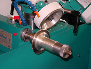 The machine has two motors, one to drive the knife carrier shaft and the second to drive the grinding wheel. The assemblies are mounted on a heavy and substantial cast iron base through which the knife carrier shaft passes carried on self lubricating bearings with grit excluders. The machine will accommodate circular knives of all designs and sizes up to 200mm dia dependant on the rate of required stock removal. This machine is designed essentially for knives at the smaller end of the range. Adjustments are made using quick release clamp levers. Accurate facilities are provided for all grinding angles, positive or negative using clearly graduated scales, and a vertical pillar at the rear of the machine provides adjustment for height and knife diameter. The rotating blade is fed into the grinding wheel automatically at a constant and adjustable rate, controlled by a ratchet and cam arrangement. The ratchet also incorporates a detachable slide which can be preset so that after a pre-determined amount of stock has been removed, feed will be automatically arrested. After locating the blade, the whole operation, which covers grinding, feed and limit, and deburring if requested, is automatic and the inaccuracies and variations of hand grinding are avoided.