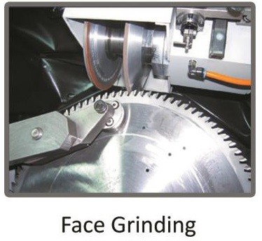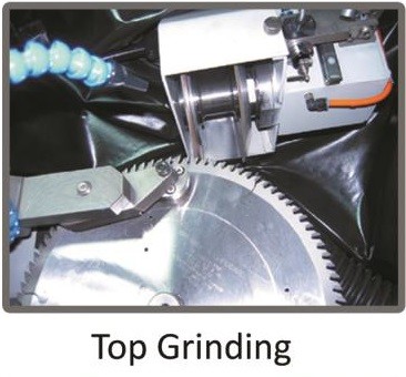 Double wheel grinder for faces and tops of TCT saws in one cycle pass.